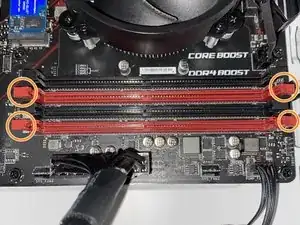 Материнские платы различаются. На этой плате (MSI B450 Gaming Plus Max) с каждой стороны есть по защёлке. Нажмите на них, чтобы освободить каждую плату.