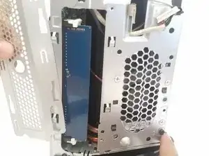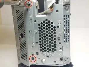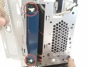 Снимите 2 чёрных винта Phillips на внешней стороне корпуса, слева от вентилятора.