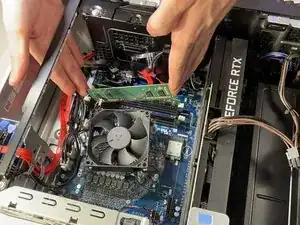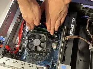 Плотно надавите на планку оперативной памяти, пока не услышите щелчок с обеих сторон.