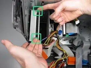 Соберите два зеленых рычага в направлении друг к другу, чтобы освободить оптический привод, и поднимите его.