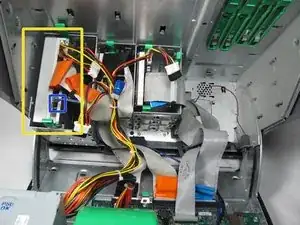 Удалите IDE-кабель от оптического привода, потянув вверх за оранжевую пластиковую вкладку.