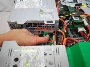 Правым указательным пальцем нажмите на защёлку с зелёной наклейкой, расположенную под блоком питания.