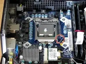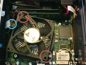 После этого отсоедините кабель вентилятора от материнской платы в месте, отмеченном синей меткой.
