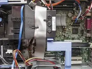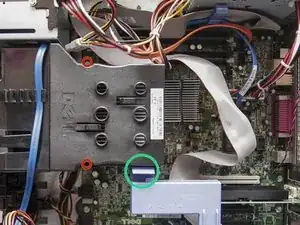 Если у вас установлен дисковод гибких дисков, его ленточный кабель проходит над системой охлаждения и его необходимо отвести в сторону. Чтобы отключить его, сначала отсоедините от системной платы, потянув за пластиковое кольцо.