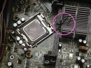 Отпустите синий пластиковый фиксатор под системой охлаждения, нажав на язычок и отведя рычаг вниз и в сторону от системы.
