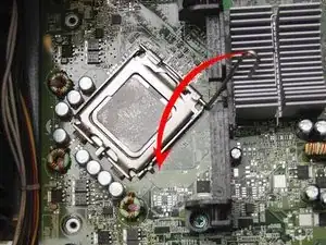 Процессор удерживается небольшой металлической крышкой. Крышка закреплена рычагом с защёлкой. Нажмите этот рычаг вниз к материнской плате, одновременно выдвигая его из-под защёлки.