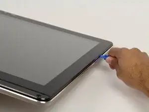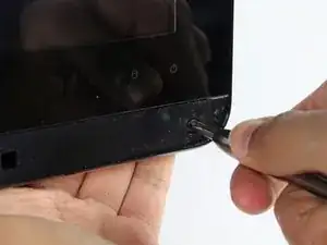 Используйте пластиковый инструмент для открытия, чтобы поддеть черную пластиковую полоску внизу экрана, пошатывая инструмент между полоской и экраном.