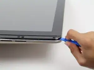 Зажмите пластиковый инструмент для открытия между экраном и рамкой алюминиевого корпуса компьютера.
