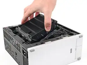 Выньте вентилятор из шасси, убедившись, что кабели продеты через боковую часть радиатора.