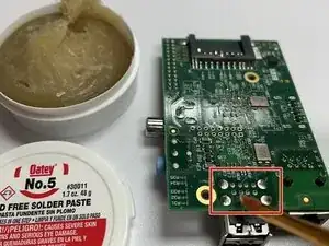 Нанесите флюс вокруг 12 USB контактов на печатной плате.