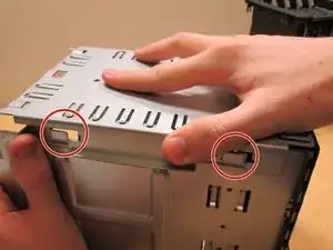 Повторите то же с другой стороны, нажимая фиксирующие штифты вниз. Затем выдвиньте доки для жёстких дисков.