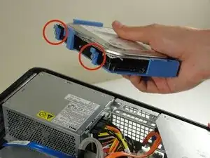 Нажмите на большой голубой язычок в жесткий диск и оттяните жесткий диск от стенки корпуса.