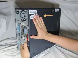 Удерживая фиксатор, положите другую руку на боковую сторону корпуса и сдвиньте боковую панель влево, пока она не освободится.
