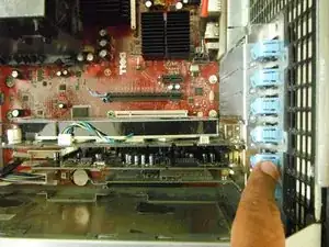 Чтобы освободить звуковую карту от корпуса материнской платы: найдите синий язычок, который третий с конца (пятый сверху), и нажмите вниз и вправо на язычок.