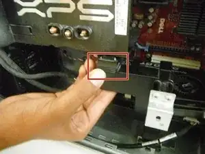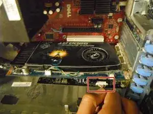 Чтобы отключить провод, соединяющий звуковую карту с материнской платой: крепко ухватитесь за провод и потяните его наружу, к себе.