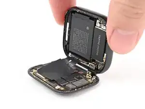 Перед началом ремонта снимите часы с зарядного устройства и дождитесь полной разрядки аккумулятора — часы должны выключиться из-за низкого заряда. Повреждённый литий-ионный аккумулятор при наличии заряда может загореться.