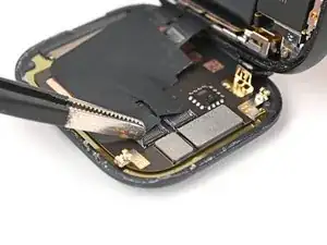 Воспользуйтесь пинцетом, чтобы приподнять ленту, закрывающую два разъёма ленточных кабелей экрана.