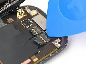 Воспользуйтесь кончиком плоского инструмента, чтобы поддеть маленькие поворотные фиксаторы на обоих разъёмах ленточных кабелей экрана.