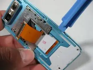 Отогните синюю ленту, но не удаляйте её, чтобы получить доступ к двум центральным винтам.