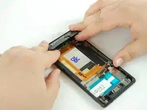Снимите металлическую крышку сборки дисплея, подняв ее и вытащив от края телефона к центру. Отключите разъем дисплея. Крышка сборки гибкая и может сгибаться, будьте осторожны при приложении силы. Аккуратно отклейте разъем от нижней стороны крышки дисплея.