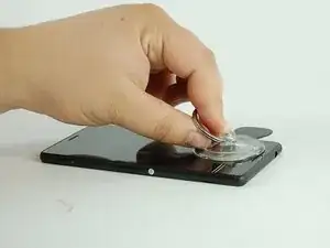 Прикрепите присоску ближе к верхней части телефона и используйте пластиковый инструмент, чтобы разорвать клеевое соединение между экраном и корпусом телефона. Поворачивая инструмент, можно помочь отделить заднюю панель от шасси.
