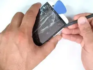 Используйте острый нож и слегка приподнимите стекло в одном из углов. Когда появится достаточно места, вставьте пластиковый инструмент.