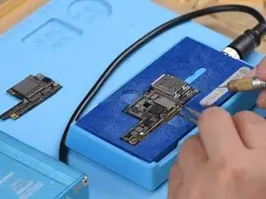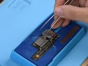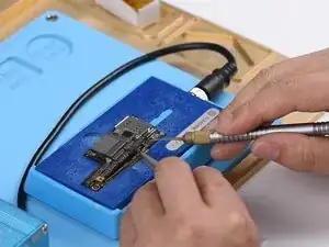 После удаления нанесите флюс для пасты на контактную площадку. Установите новый U_PMIC_E на место и припаяйте феном при 330℃, расход воздуха 3.