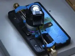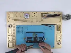 Закрепите материнскую плату в держателе печатной платы. Нагрейте с помощью фена для горячего воздуха при 200℃, поток воздуха 3. Снимите наклейку для теплоотведения с задней стороны материнской платы.