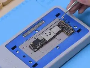 Сначала размещаем плату на рабочей платформе. Подключите чёрный щуп источника питания к земле, а красный щуп — к линии PP_BATT_VCC. В верхнем левом углу температура повысилась. Можно подтвердить, что неисправный компонент находится в верхнем левом углу.
