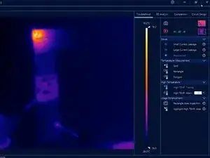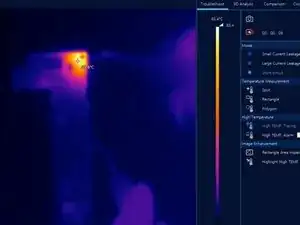 После остывания логической платы включите питание платы. Подключите чёрный щуп к земле, а красный — к линии PP_VDD_MAIN. По тепловому изображению теперь можно точно определить неисправный компонент. Конденсатор повреждён, видны обугливание и следы горения.