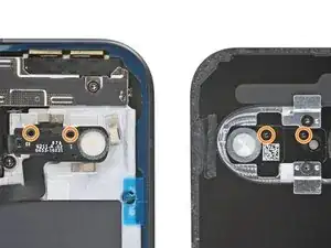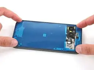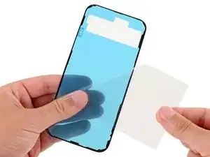 Аккуратно разместите клей на рамке так, чтобы большой вырез совпадал с модулями камер. Используйте кромку рамки, чтобы помочь позиционировать лист.