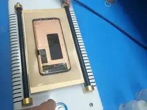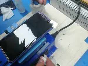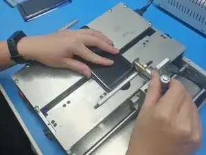 Поместите экран на нагревательную платформу''' ручного разделителя ЖК с мощным вакуумом'''. Установите температуру нагрева на 90℃. Нагревайте примерно 30 с. Нарежьте OCA-пленку на полосы и капните средство для удаления клея X11 в зазор корпуса батареи. Затем медленно соскребите холодный клей через отсек батареи с помощью отрезанной полоски.