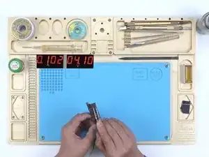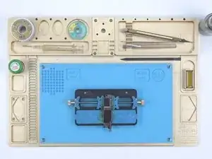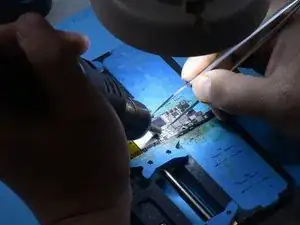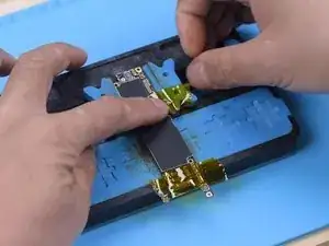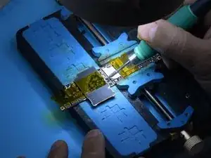 Можно судить, что плата неисправна. Отключаем гибкий кабель и снимаем плату. Удаляем пену на плате и резину. Закрепляем плату в держателе. Накладываем термостойкую ленту для защиты разъёма. Снимаем экранную крышку шлейфов с помощью вертикального термовоздушного пистолета при 380℃.