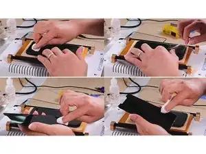 Не останавливаемся, когда уже почти готово. Сначала установите новую рамку в защитную прижимную форму. Во‑вторых, нанесите клей для рамки вокруг кронштейна после его фиксации. В‑третьих, подгоните приклеенную ЖК‑панель к рамке. Важная деталь: размещайте ЖК‑панель со стороны расположения гибкого кабеля.