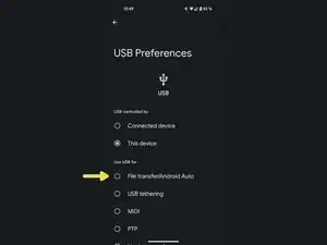 Выберите опцию Передача файлов/Android Auto.