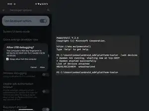 Откройте терминал на компьютере с установленными SDK Platform Tools и введите adb devices
