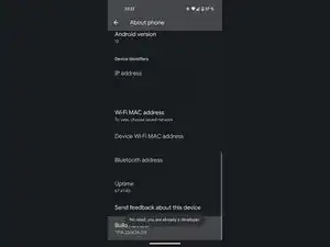 Теперь просто коснитесь номера сборки несколько раз подряд, пока не появится подтверждающее сообщение «Вы теперь разработчик!». Я уже включил параметры разработчика на своём устройстве, поэтому мне не нужно делать это снова.