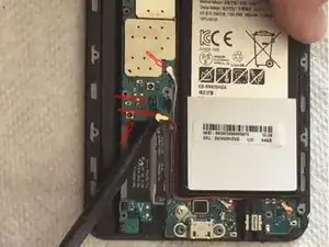 Подденьте разъем шлейфа зарядного порта, разъемы кабелей RF-сигнала и разъем под ними, как показано на фото, чтобы освободить материнскую плату.