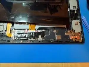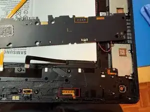 Продолжайте удалять винты, отмеченные оранжевым, чтобы освободить материнскую плату планшета. Будьте осторожны с модулем камеры под экраном справа. Он подключен к материнской плате под медной лентой. Осторожно приподнимите экран справа. Вы можете оставить камеру подключенной к материнской плате или отключить её.