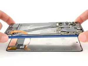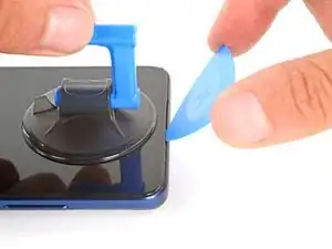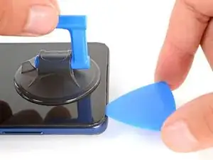 Клей под дисплеем очень прочный, поэтому может потребоваться несколько попыток. Если возникают трудности, снова нагрейте дисплей и попробуйте ещё раз.