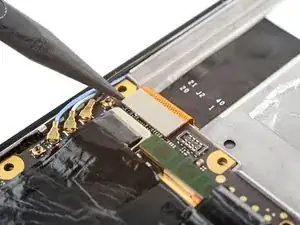 Перед снятием дисплея убедитесь, что гибкий кабель дисплея полностью отлеплен от клея на средней рамке.