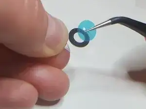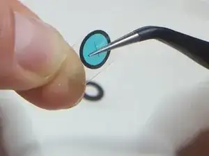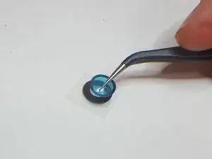 Оттолкните синюю пластиковую подложку от защитного стекла + клея. Возможно, вам придется использовать край ногтя или еще одни пинцет, чтобы прижать край защитного стекла во время этого процесса.