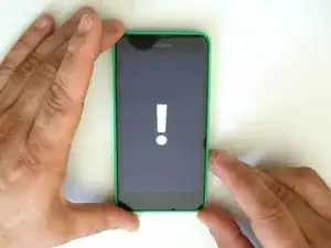 Нажмите и удерживайте кнопку питания. Когда телефон завибрирует, отпустите её и нажмите и удерживайте кнопку уменьшения громкости, пока на экране не появится восклицательный знак.