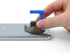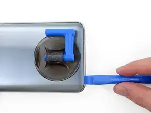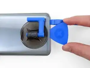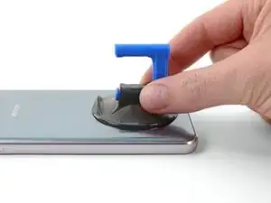 Поднимите нижний край задней панели с помощью присоски, образуя небольшой зазор между панелью и рамой.