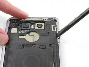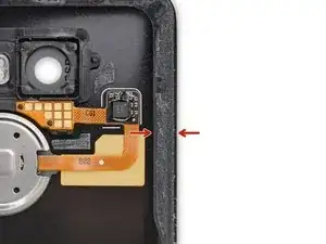 Как показано на шаге 1, кабель сканера отпечатков пальцев проходит слева от камеры, довольно близко к краю телефона. Будьте осторожны при разрезании клея в верхней части телефона.