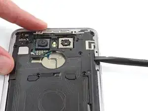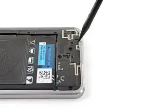 Вставьте плоский конец лопатки в небольшой зазор между верхним экраном антенны и шасси телефона и подденьте экран, освободив защелки, которые его удерживают.
