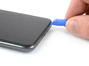 Проведите монтажным инструментом вдоль верхнего края телефона, чтобы освободить пластиковые защёлки, удерживающие заднюю крышку.