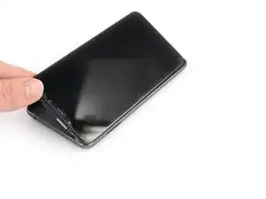 Проведите монтажным инструментом к нижнему правому углу, чтобы освободить пластиковые защёлки, удерживающие заднюю крышку.