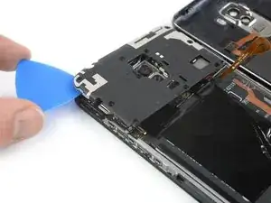 Используйте плоский конец лопатки, чтобы поддеть и отключить коннектор гибкого кабеля датчика отпечатков пальцев.