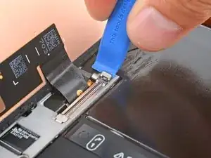 Вставьте плоский конец лопатки между нижней частью кабеля антенны 5G mmWave и средним каркасом, прямо над нажимным разъёмом.